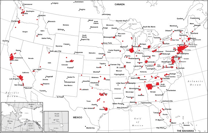 We have shipped significant products or designs to at least 45 states and Canada! The distribution map is shown below - each red dot represents a distinct customer project destination: